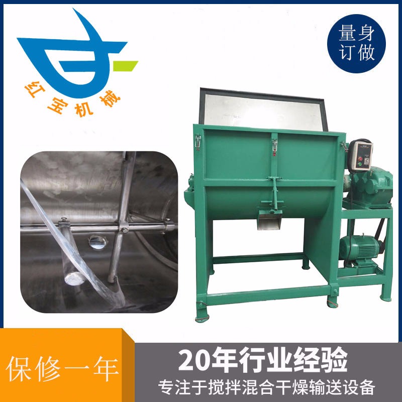 干粉臥式攪拌機(jī)實(shí)際上是一種混合率高、殘留物少的設(shè)備。也可廣泛應(yīng)用于塑料顆粒、塑料粉、化工粉、油漆、硅藻土、藥粉、中藥粉等粉末。本實(shí)用新型的特點(diǎn)是:雙螺旋帶結(jié)構(gòu),兩側(cè)物料通過大螺旋帶由兩側(cè)向中間推送,中間物料通過小螺旋帶向兩側(cè)推送,除適合攪拌粉末外,還可以加入液體藥劑,根據(jù)需要添加噴淋裝置,并通過空氣壓力原理將液體驅(qū)動(dòng)到水平混合器的頂部,然后用噴頭噴灑液體。